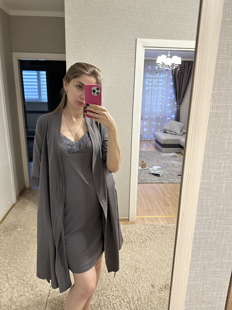 Практичный и невероятно удобный комплект в роддом для беременных и кормящих из 100% Хлопка, который состоит из ночной сороки и халата с запахом. Сорочка - оптимальной длины, выполнена из однотонной хлопковой ткани Премиального качества, на бретелях с регуляторами из декоративной резинки. Верх изделия разработан для максимального комфорта во время кормления грудью. Крайне привлекательно смотрится декоративная отделка кружевом. Халат с запахом, удобным поясом, боковыми карманами и рукавом 3/4. Длина - ниже колена. По низу рукавов - отделка эластичным кружевом. В боковом шве 3 петли для регулировки высоты пояса. Такой комплект, состоящий из халата и сорочки, ни в коем случае не останется без внимания. Вы сможете носить его и после беременности, ведь он невероятно удобный и универсальный. Характеристики: 100% хлопковая ткань Премиум; Обработка декоративным эластичным кружевом; Оптимальная длина изделий; Бретели с регуляторами; Комфорт во время кормления; Боковые карманы; 3 уровня регулировки высоты пояс